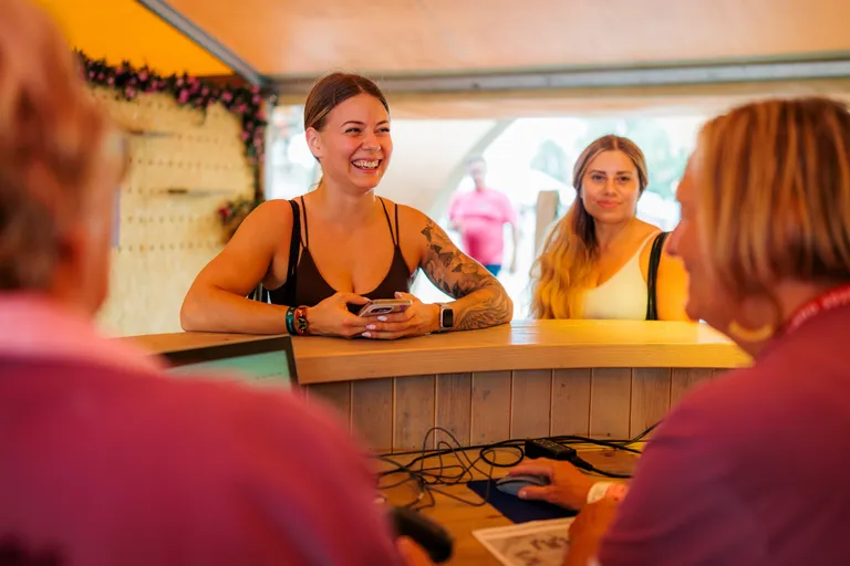 Wastafels en toiletten zijn altijd beschikbaar. De overdekte doucheruimte is betalend en heeft openingstijden die bij de tent worden aangegeven. Deze ruimte biedt afgesloten douchecabines met warm water en stroompunten voor je eigen stylingtools.